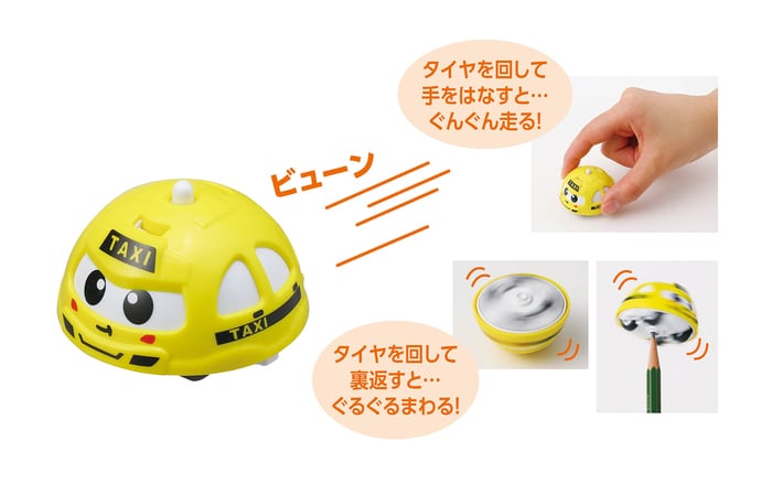 タイヤをまわして裏返すとぐるぐるまわる。タイヤをまわして手をはなすとぐんぐん走る。