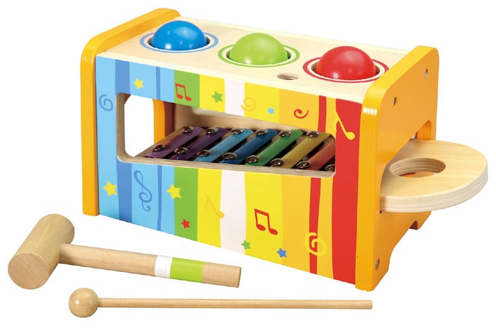 # セット内容 本体×1、鉄琴×1、ボール(青・緑・赤)×各1、ハンマー×1、ばち×1