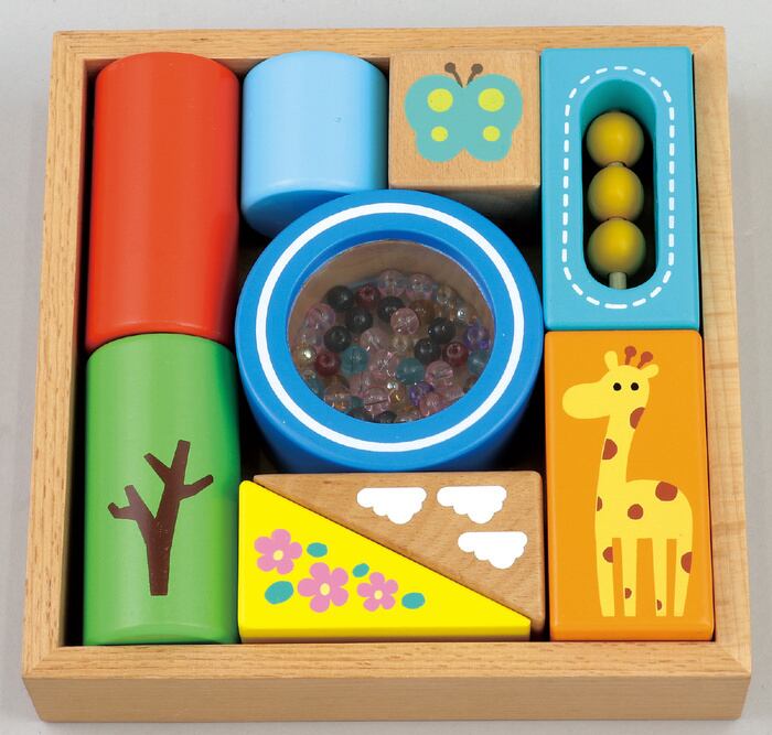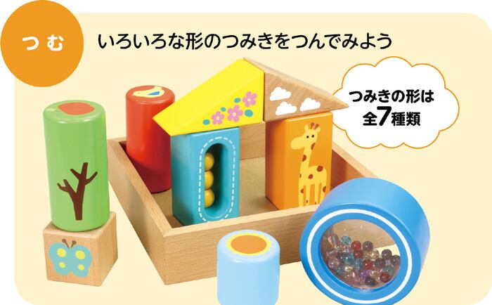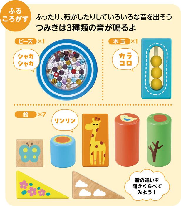 # セット内容 円柱(ビーズ)×1、円柱(大)×2、円柱(小)×1、直方体(木玉)×1、直方体×1、立方体×1、三角×2、木箱×1