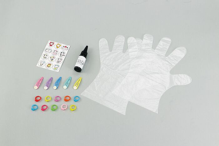 UVクリアレジン25g×1、ヘアピンパーツ×5、指輪パーツ×10、ビニール手袋×2、もちもちぱんだイラストカード×1