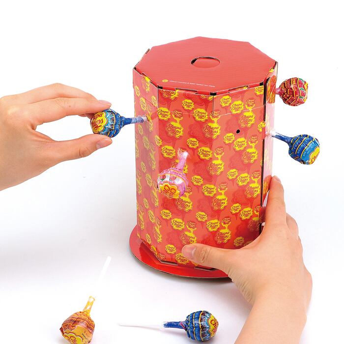 チュッパチャプスを穴にさすと、どこでロゴが飛び出すのかドキドキハラハラ! 家族や友達と一緒に、笑いと驚きの瞬間を楽しみながら、楽しい時間を過ごしてみませんか?ポップアップの仕掛けはきっとあなたの想像を超えるワクワク感を与えてくれます。