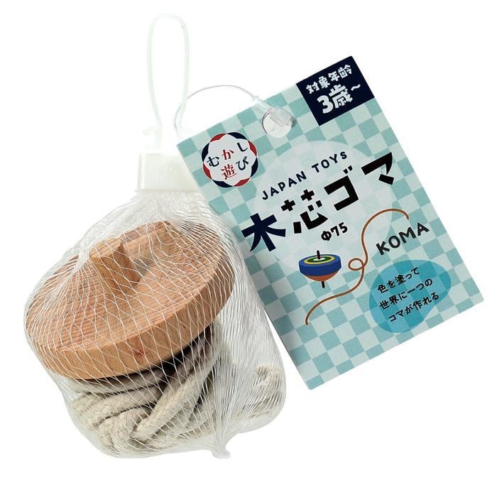 木製のコマです。無着色なのでオリジナルのコマがつくれます。平らなので自由に絵が描きやすくなっています。丈夫な組みひもを使用しています。木製なので床が傷つきにくくなっています。