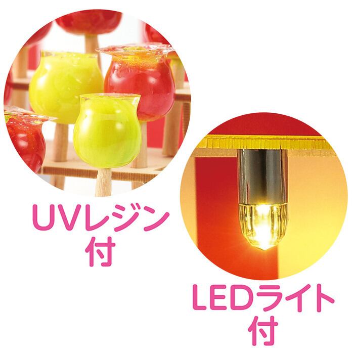 レーザーパーツ×4、印刷済台紙×2、不織布(桃)×1、刺繍糸×1、たこ糸×1、バルーンLEDライト×1、UVレジン×1、軽量粘土×1、透明小袋×9、竹ひご×1、つまようじ×12、両面テープ×3、紙やすり×1、木工用接着剤×1、ピンセット×1