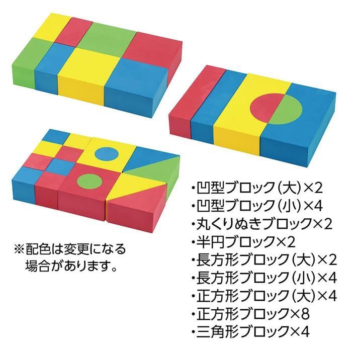 # セット内容 凹型ブロック(大)×2、凹型ブロック(小)×2、丸くりぬきブロック×1、半円ブロック×2、丸型ブロック×2、長方形ブロック(大)×2、長方形ブロック(小)×4、方形ブロック(大)×4、方形ブロック×8、三角形ブロック×4(色取り混ぜ)、取説×1