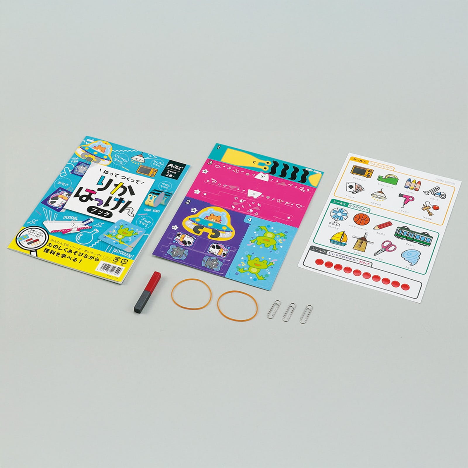 サイズ:りかはっけんブック本体210×150×5mm、10ページ、ゼムクリップ6×28×1mm、棒フェライト磁石58×8×6mm、輪ゴム40×40mm
