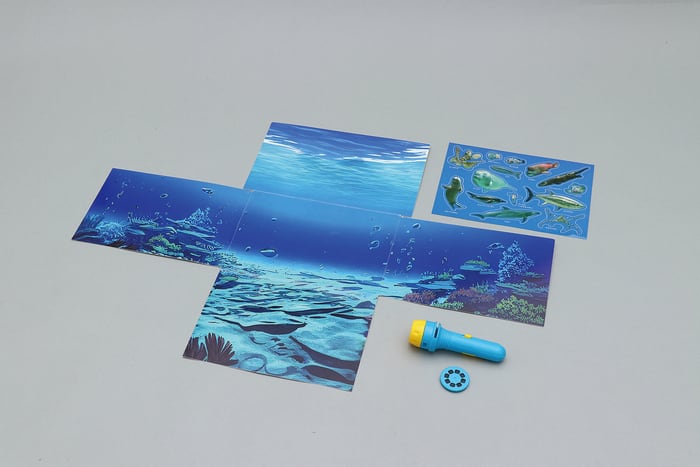大人気のうみのいきものプロジェクターに海の中をデザインしたシールブックがセットになって登場