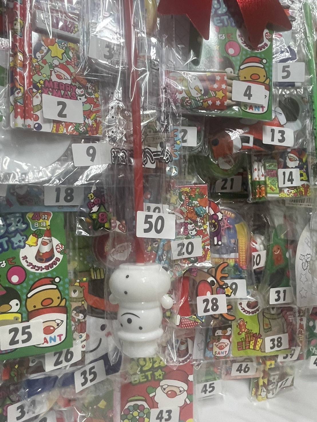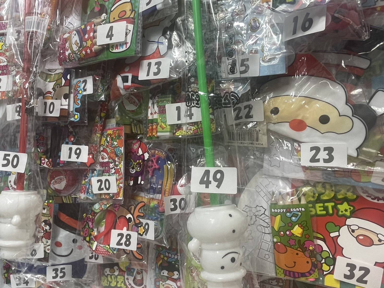 クリスマスにぴったりのおもちゃが50個と+くじ紙が付いた商品です。
