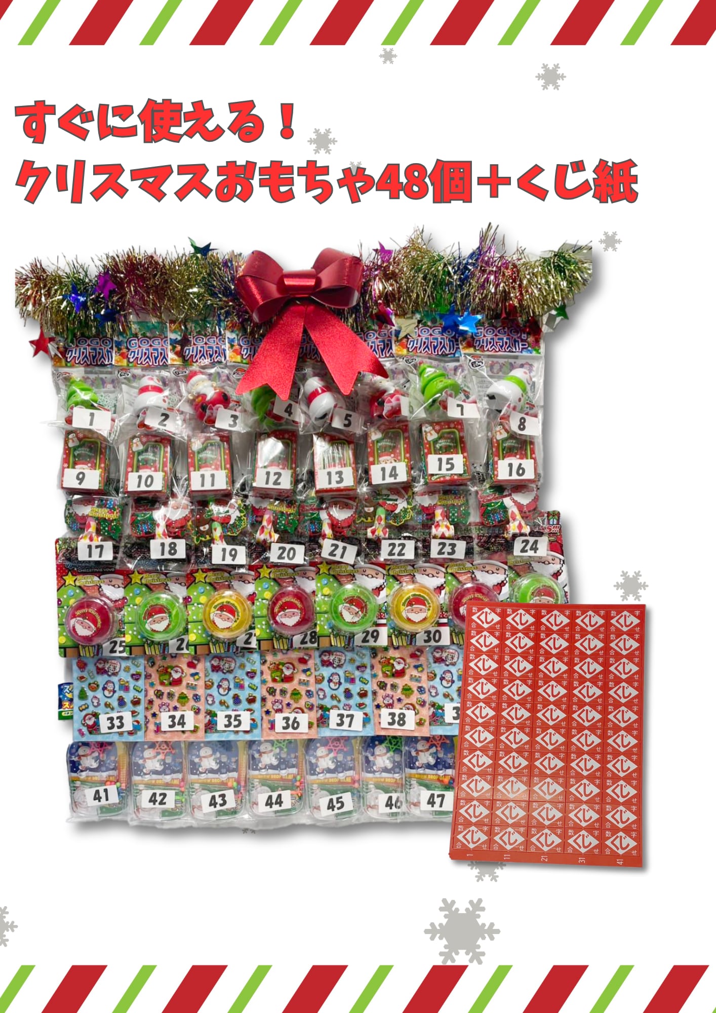 クリスマスにぴったりのおもちゃが48個と+くじ紙が付いた商品です。